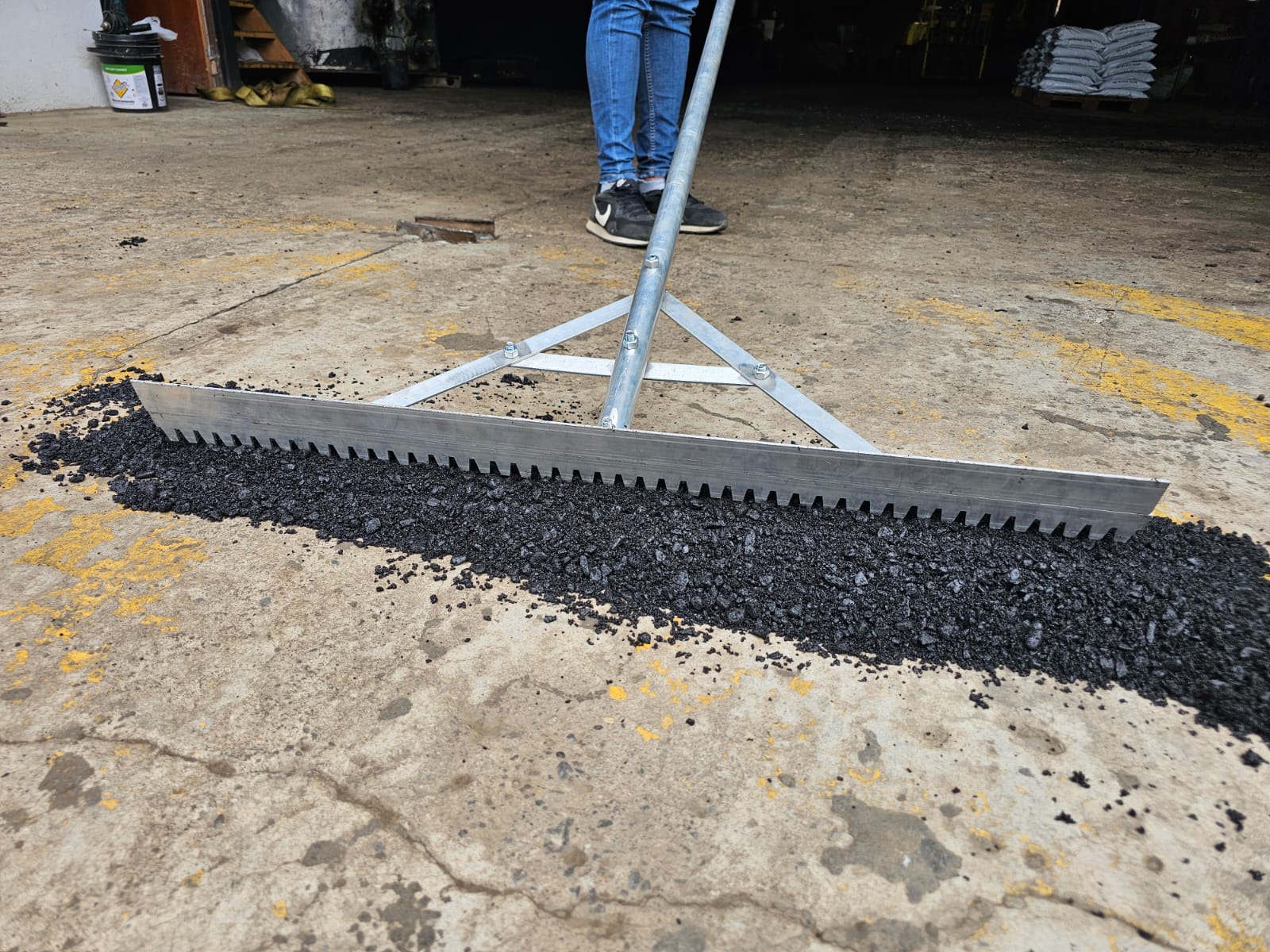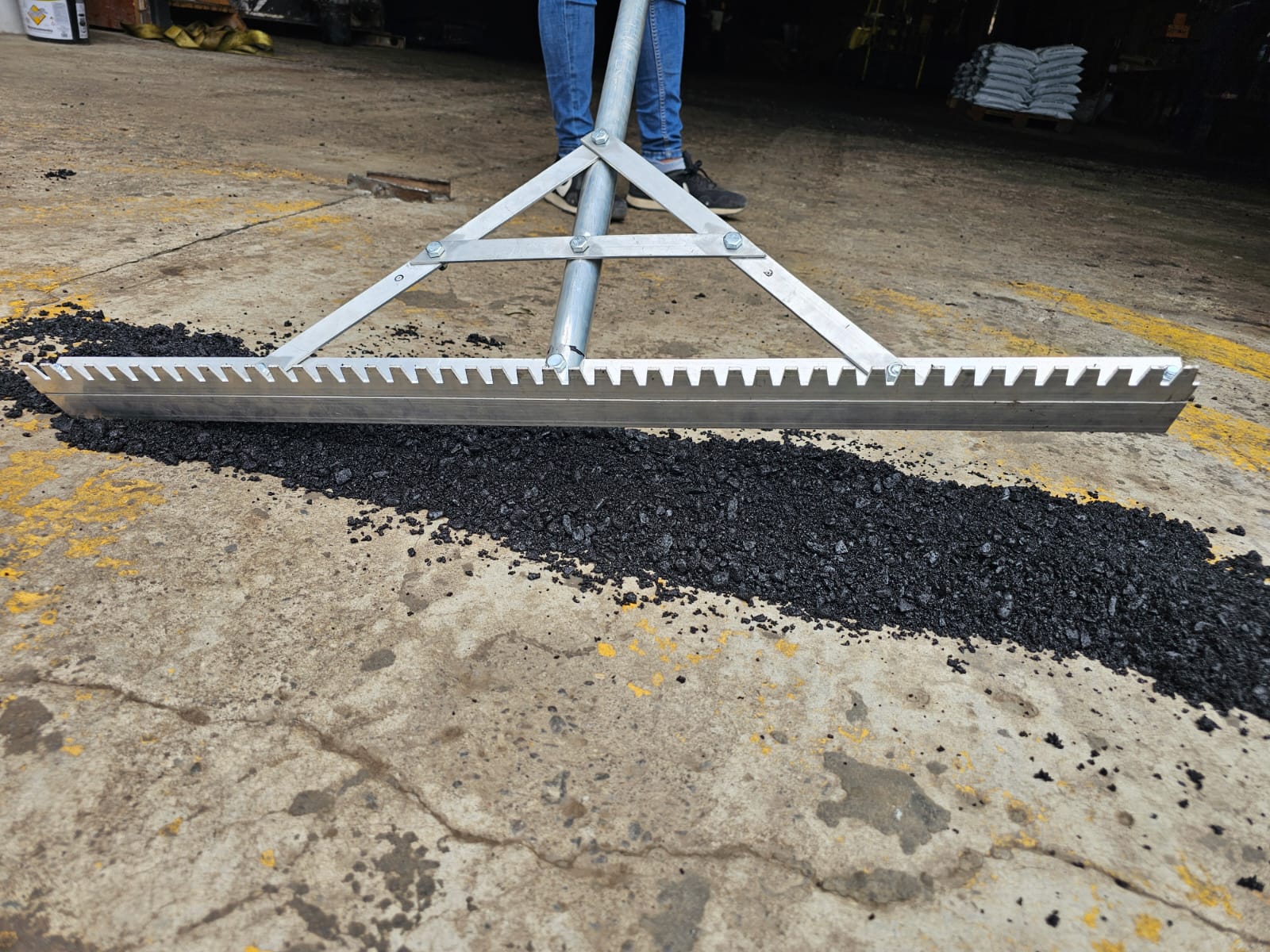 Herramienta especializada que facilita la distribución y nivelación uniforme del asfalto fresco durante obras viales, asegurando una superficie compacta y lisa para mayor durabilidad y acabado profesional.
